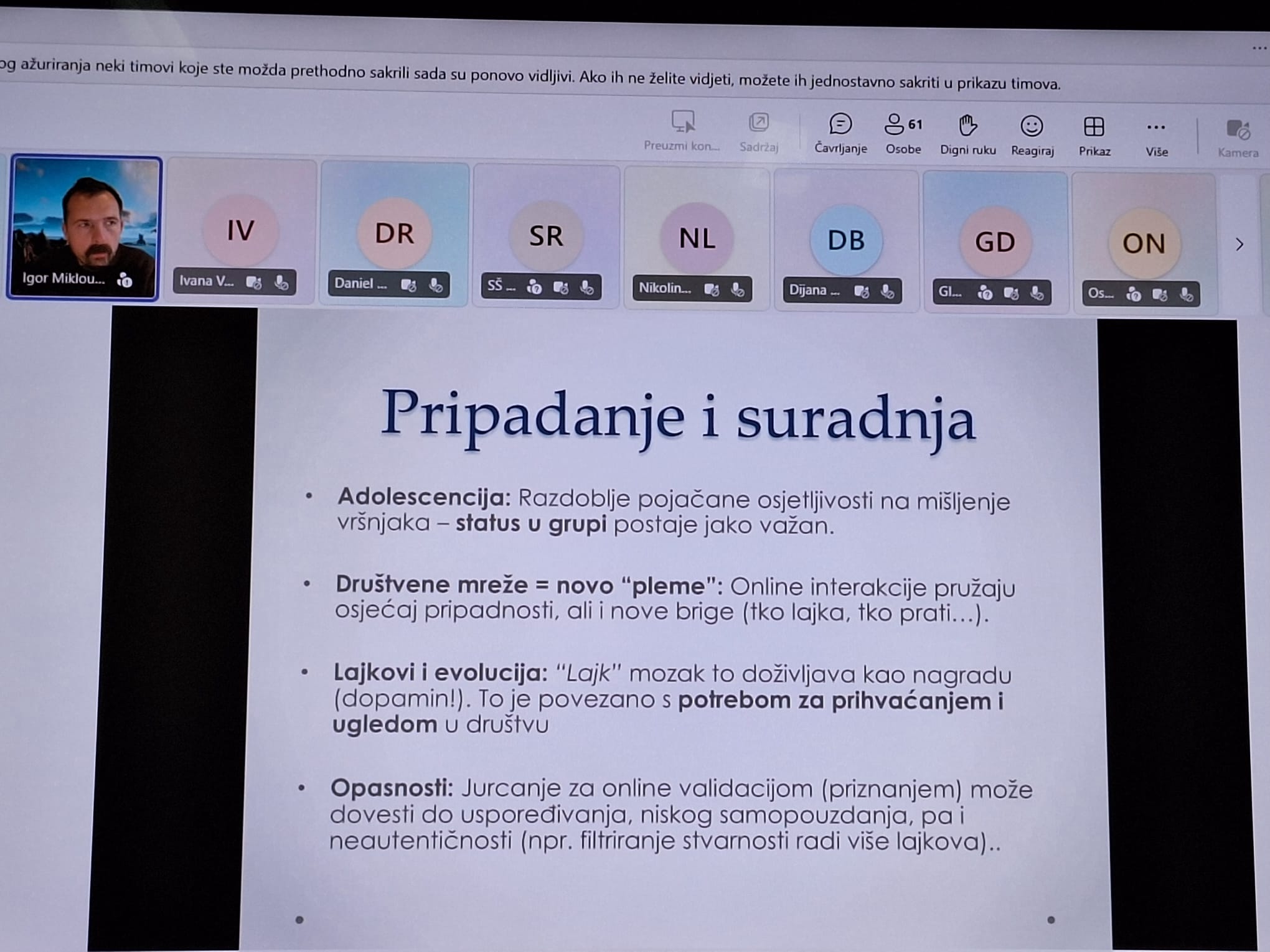 7.c razred naše škole na satu informatike sudjelovao je u programu slušajući predavanje „Evolucijska psihologija – nova znanost za razumijevanje uma iz kamenog doba“, koje je održao dr. sc. Igor Mikloušić. Predavanje je učenicima približilo načine na koje evolucijska psihologija objašnjava ljudsko ponašanje te pokazalo kako suvremena znanost pomaže razumjeti čovjeka i svijet oko njega.