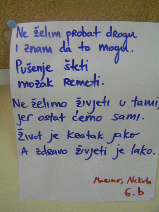 Nizom aktivnosti, radionica i predavanja u našoj školi obilježit ćemo Mjesec borbe protiv ovisnosti, s ciljem preventivnog djelovanja i educiranja učenika o štetnosti konzumiranja raznih sredstava ovisnosti te podučavanja i vježbanja socijalnih vještina kako bi se učenici mogli oduprijeti negativnim pritiscima vršnjaka i okoline.