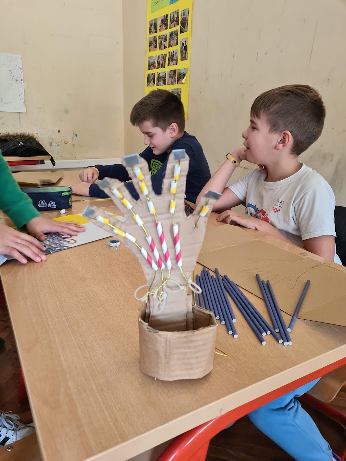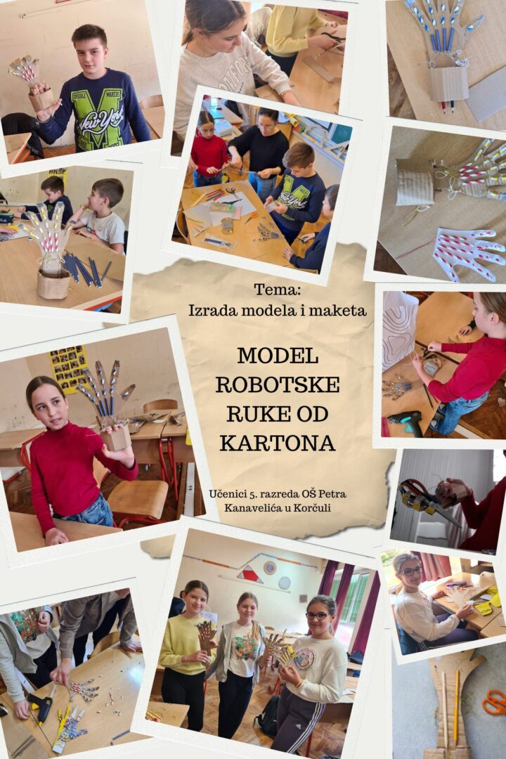 Učenici petih razreda su se upustili u izradu modela robotske ruke od kartona u sklopu eTwinning projekta ŠTEAM-ajmo 2. Uz pomoć svojih nastavnica iz informatike i matematike stvorili su model robotske ruke po uzoru na vlastitu.